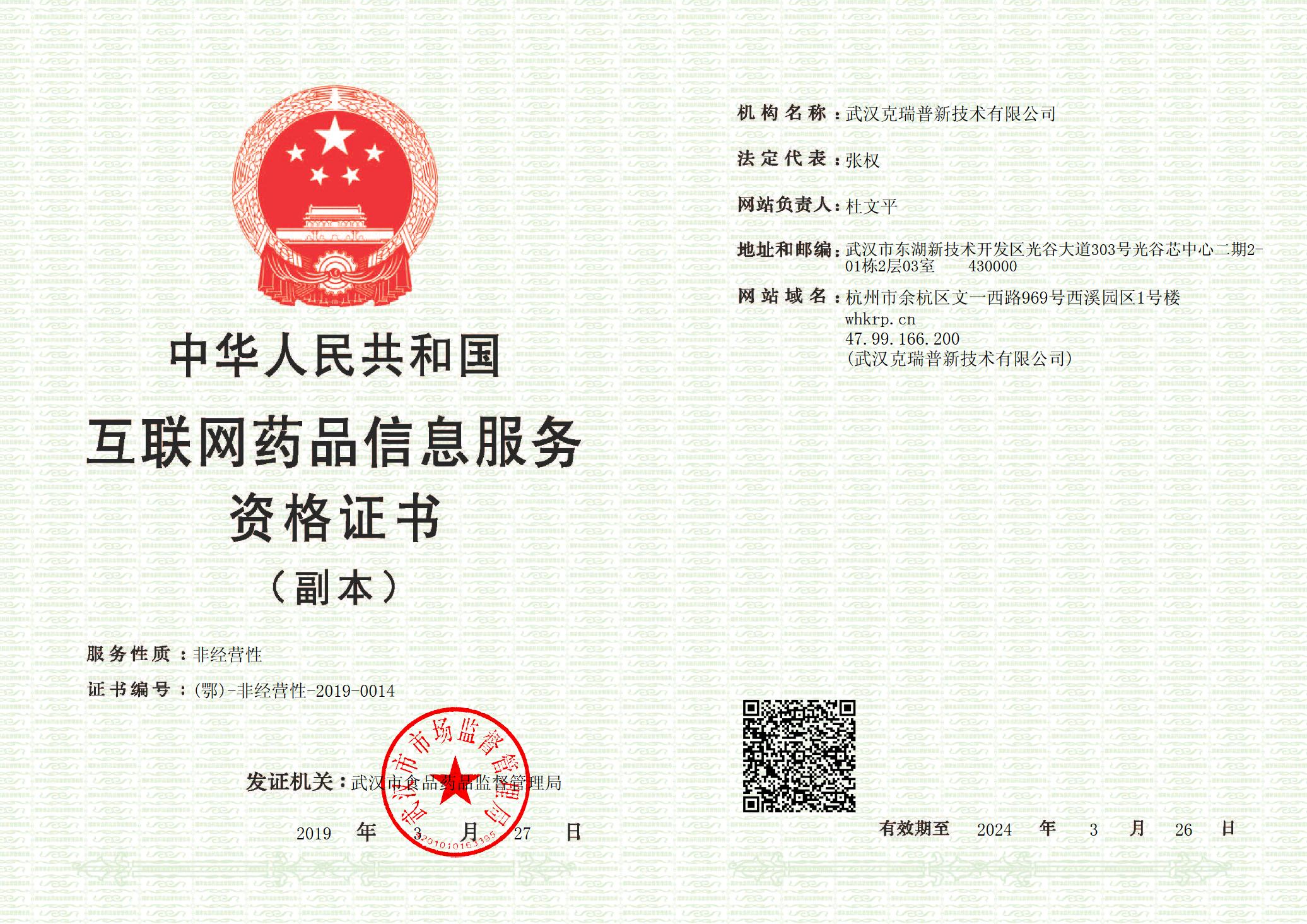 互聯(lián)網(wǎng)藥品信息服務(wù)資格證書 證書編號(hào):(鄂)-非經(jīng)營(yíng)性-2019-0014