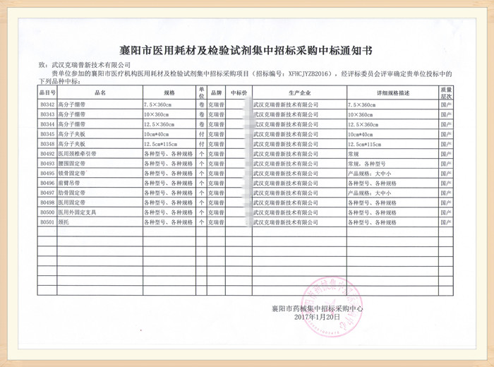 【湖北省襄陽市醫(yī)用耗材及檢驗(yàn)試劑集中招標(biāo)采購中標(biāo)通知書】武漢克瑞普新技術(shù)有限公司在參加襄陽市醫(yī)療機(jī)構(gòu)醫(yī)用耗材集中招標(biāo)采購項(xiàng)目中經(jīng)評(píng)定我們公司已成功中標(biāo),我們的中標(biāo)產(chǎn)品有高分子繃帶、高分子夾板、醫(yī)用外固定支具等多種骨科耗材產(chǎn)品,我們的骨科耗材系列產(chǎn)品都有國家出具的證書全套的資質(zhì)齊全,可適用于胸外科、骨科、急診科、理療科、整形科、120急救等。