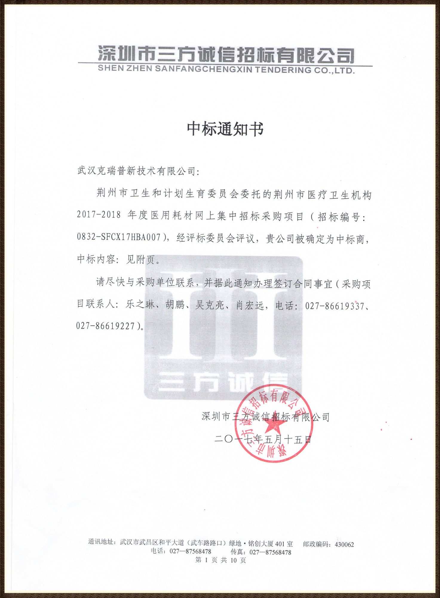 【湖北省荊州市衛(wèi)生機(jī)構(gòu)2017-2018年度醫(yī)用耗材網(wǎng)上集中招標(biāo)采購項目中標(biāo)通知書】武漢克瑞普在2017-2018年度荊州市醫(yī)用耗材集中招標(biāo)采購項目中成功中標(biāo)了以下骨科耗材產(chǎn)品具體有:胸腔固定夾板、高分子固定繃帶、高分子固定夾板、醫(yī)用固定帶(種類包含多樣)、醫(yī)用外固定支具等骨科耗材在評標(biāo)委員會的評判下我司被確定為中標(biāo)商。